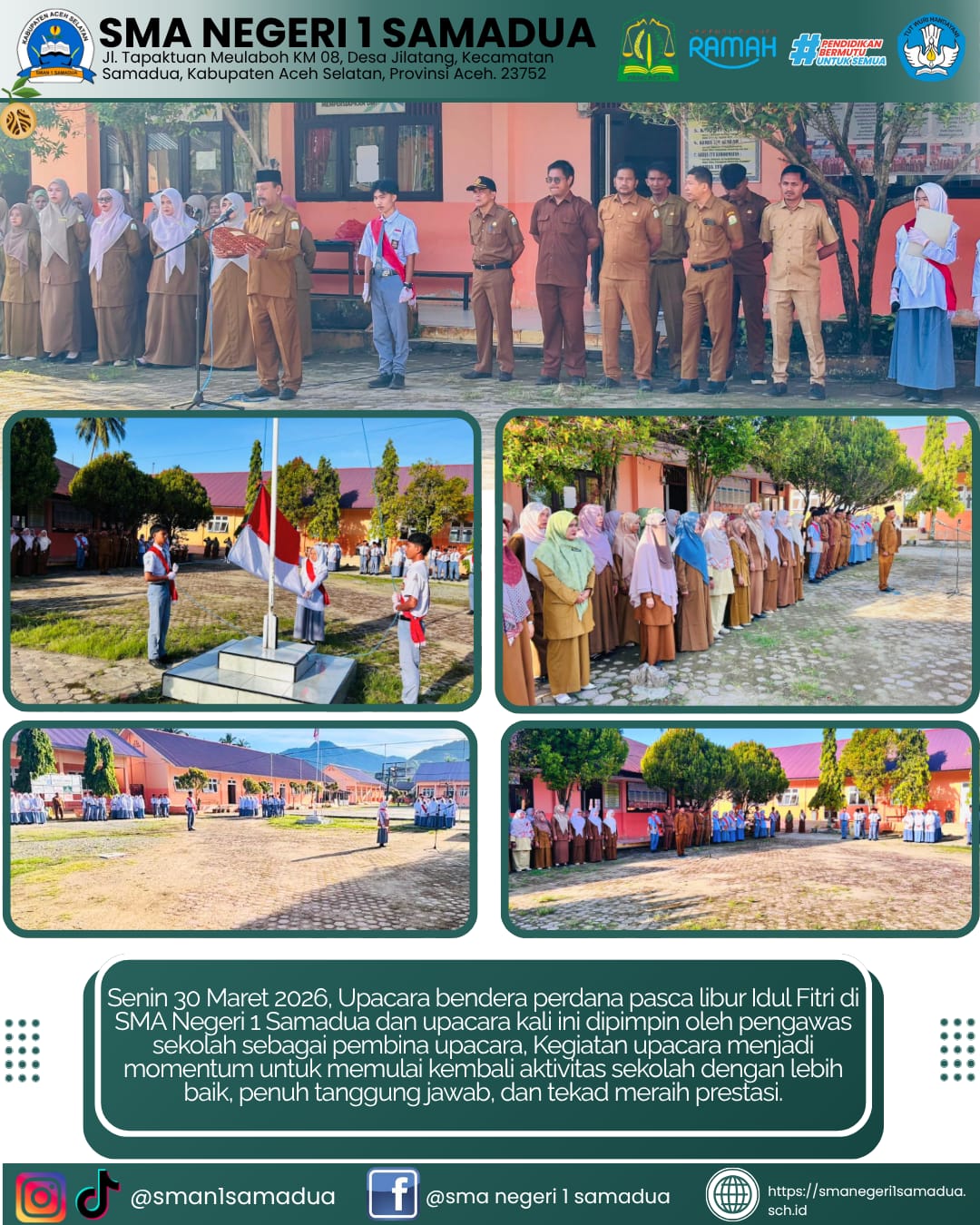 Samadua, Suasana pagi di SMAN 1 Samadua pada Senin, 30 Maret 2026, tampak penuh semangat dan kebersamaan. Hari pertama mas...